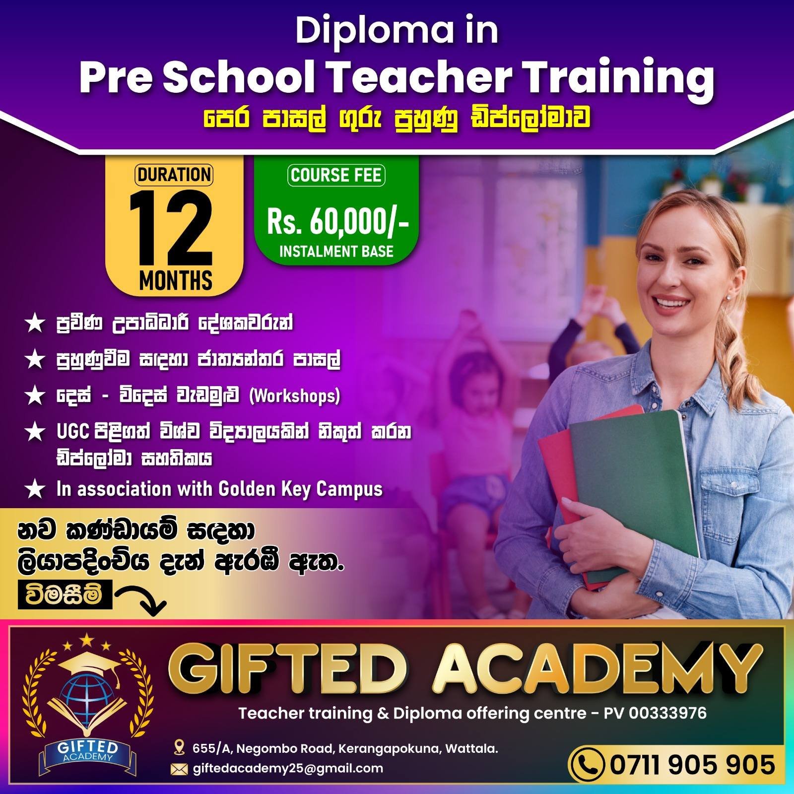 Gifted Academy is a registered Teacher Training Centre and Diploma Offering Institute in Sri Lanka (PV 00333976), located at 655/A, Negombo Road, Kerangapokuna, Wattala. We specialize in Professional Teacher Training, Diploma Programs, and Skill Development Courses designed to empower teachers, inspire students, and contribute to a brighter educational future.